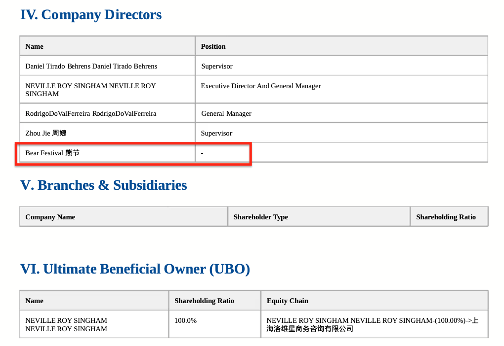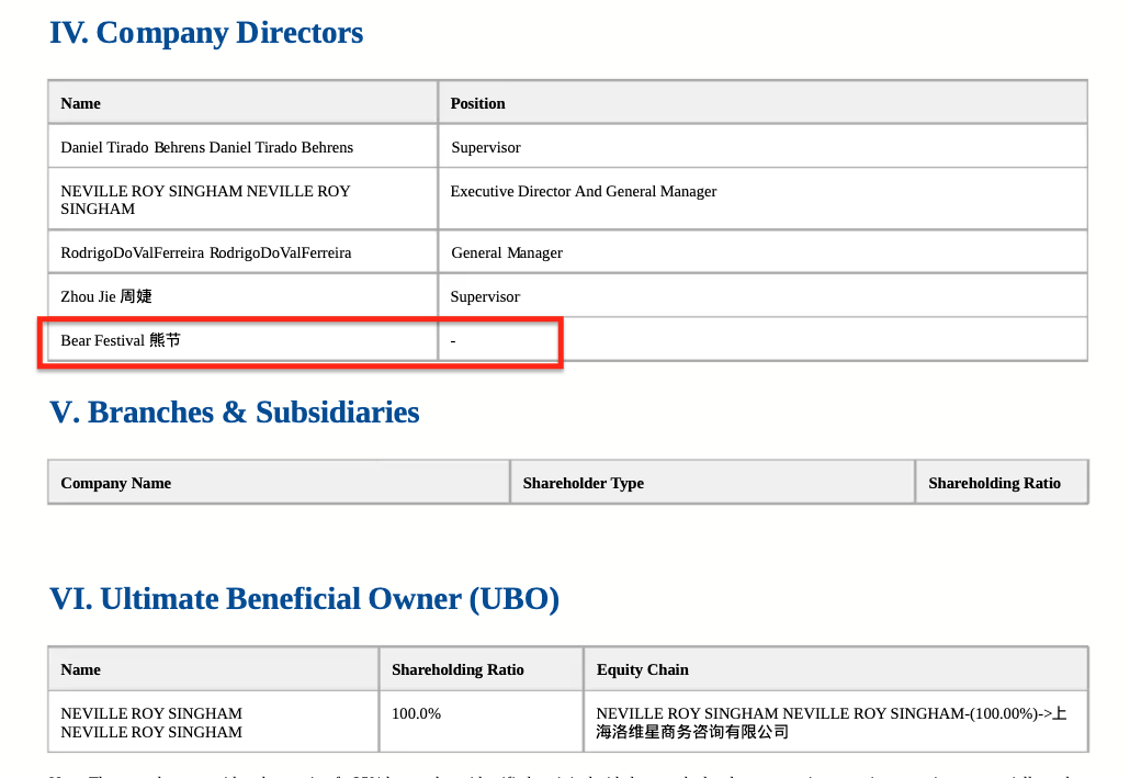 Screen image of Chinese corporate records for Maku with Jie Xiong and Zhou Yihua’s names highlighted. Note: Jie Xiong’s name appears as “Bear Festival” in English translation.