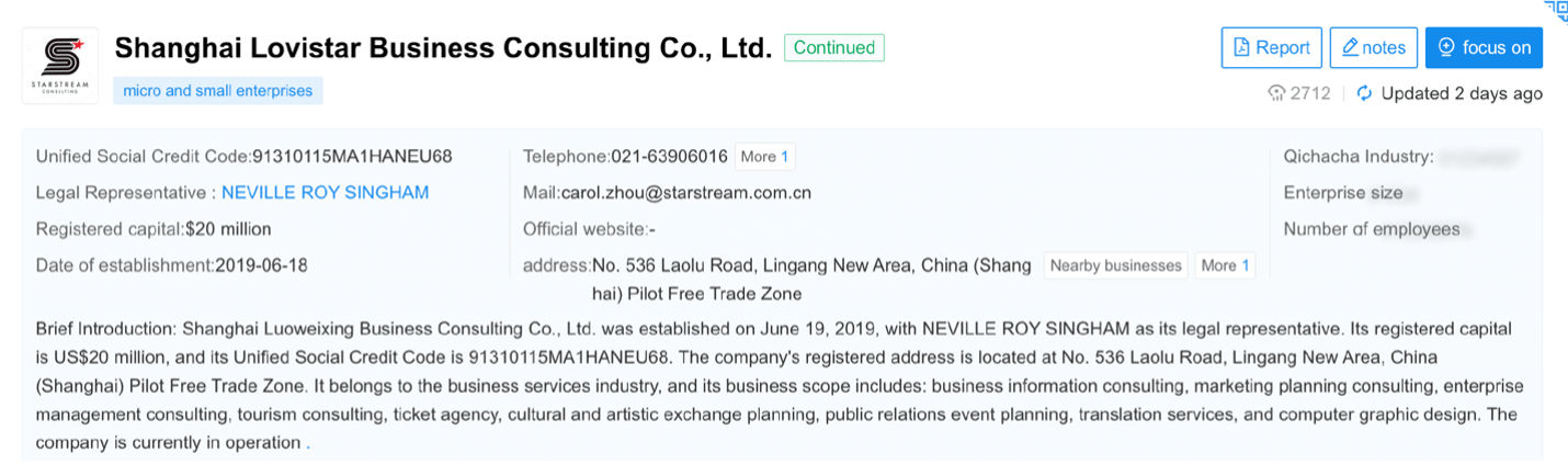 In 2019, Singham settled in Shanghai and founded a consulting firm whose official name in Mandarin is 上海洛维星商务咨询有限公司. That name in Mandarin can be translated into English in multiple ways, making tracking the firm’s online footprint challenging. The most common English translation of the company’s name is “Star Stream Consulting,” but English-language translation software sometimes renders the company’s name as ‘Shanghai Luoweixing” or “Shanghai Lovistar.”