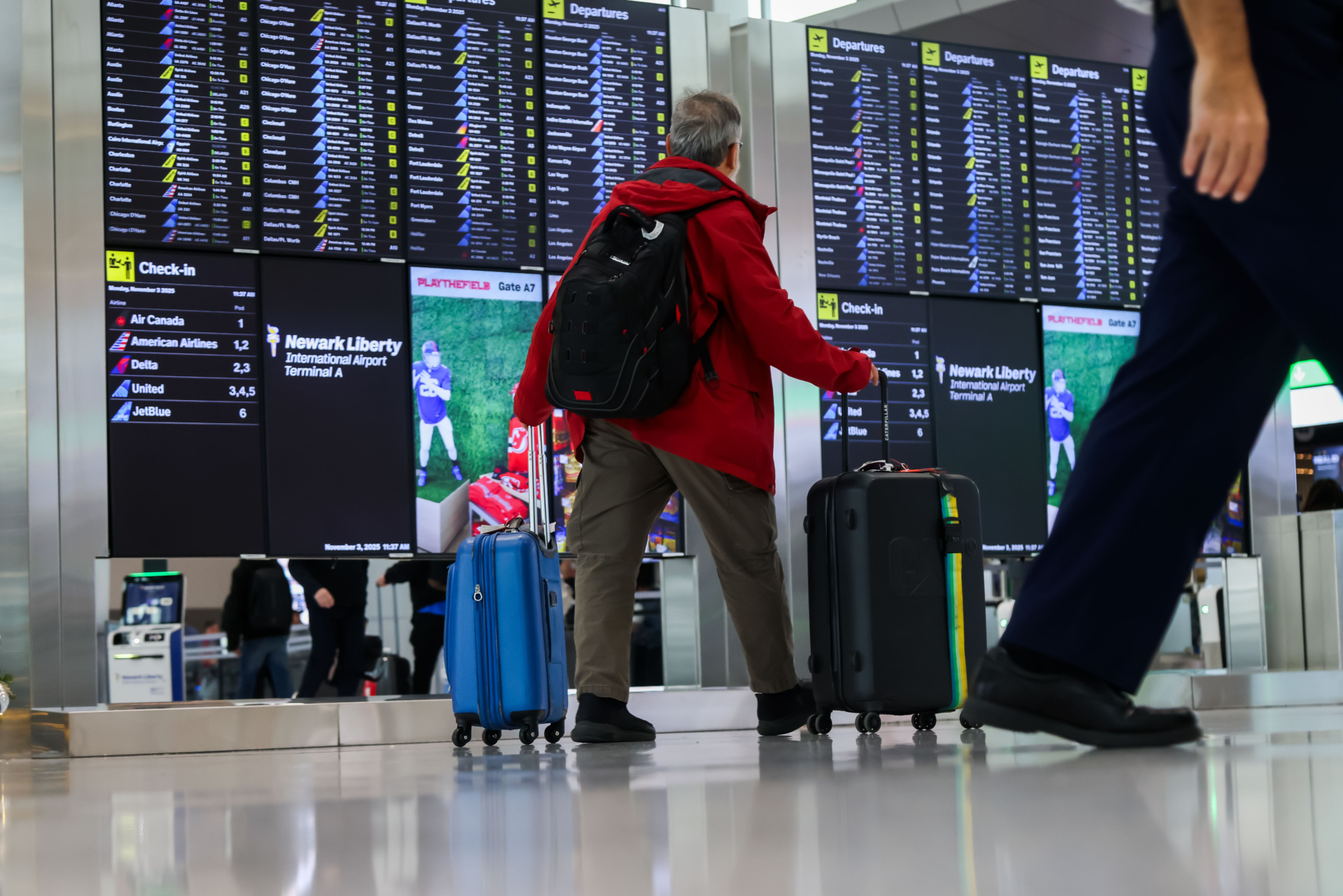 Travelers in terminal A at Newark Liberty International Airport (EWR) in Newark, New Jersey, U.S., on Monday, Nov. 3, 2025. The Federal Aviation Administration issued a temporary ground stop for some flights to Newark Liberty International Airport on Sunday due to staffing, according to an advisory. (Michael Nagle/Bloomberg via Getty Images)