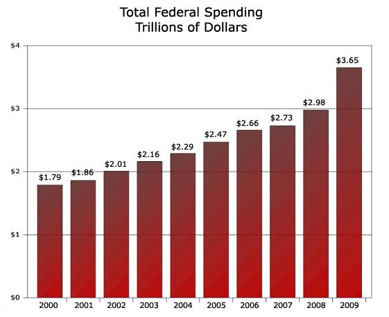 Economist Chris Edwards ran the numbers, and found that since 2000, the federal government’s budget has doubled, from $1.79 trillion to an estimated $3.65 trillion today. Much of that can be contributed to former president Bush’s giant spending programs and the increase in defense spending to pay for the wars, but the largest upswing occurred just in the past year.