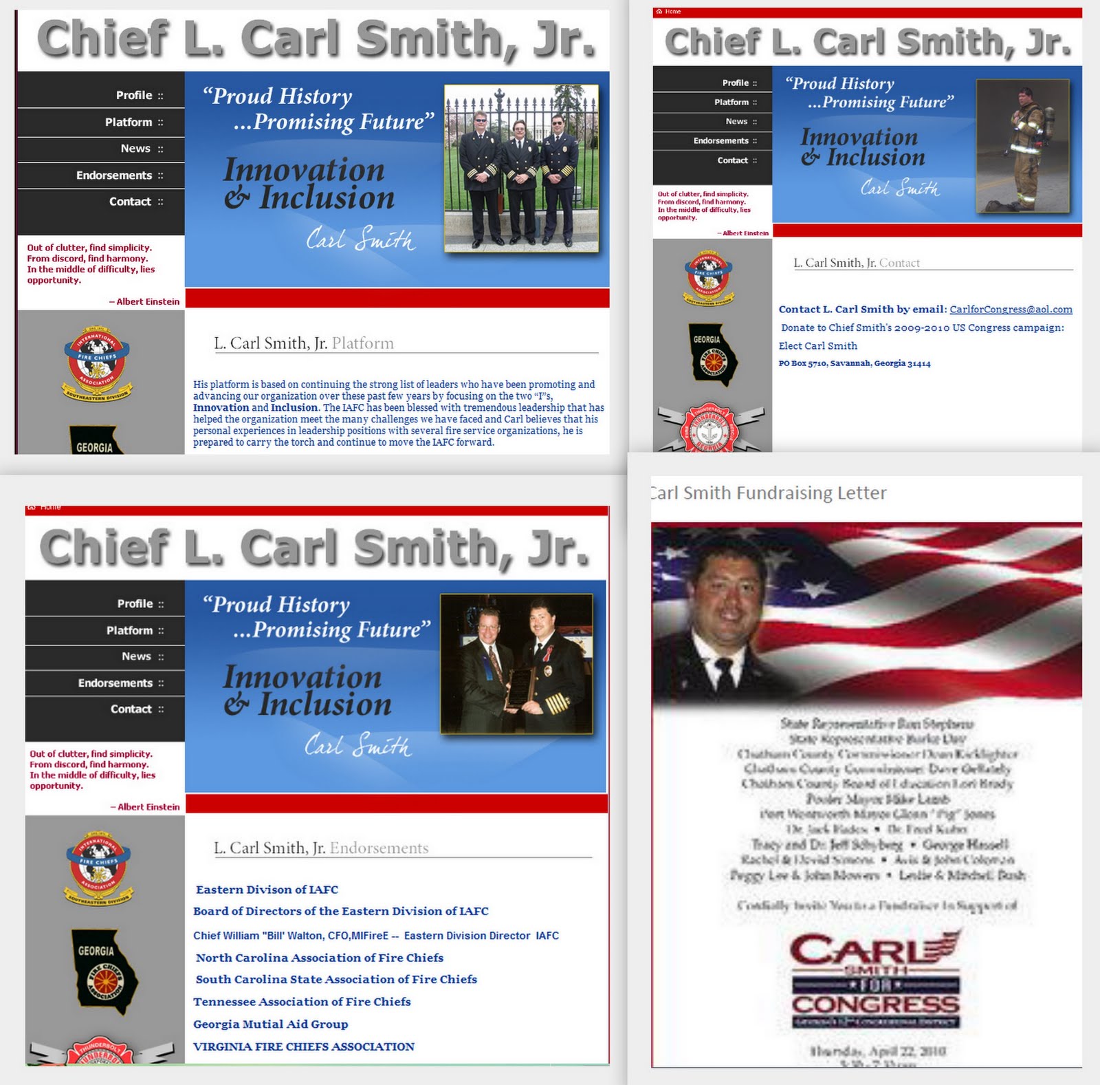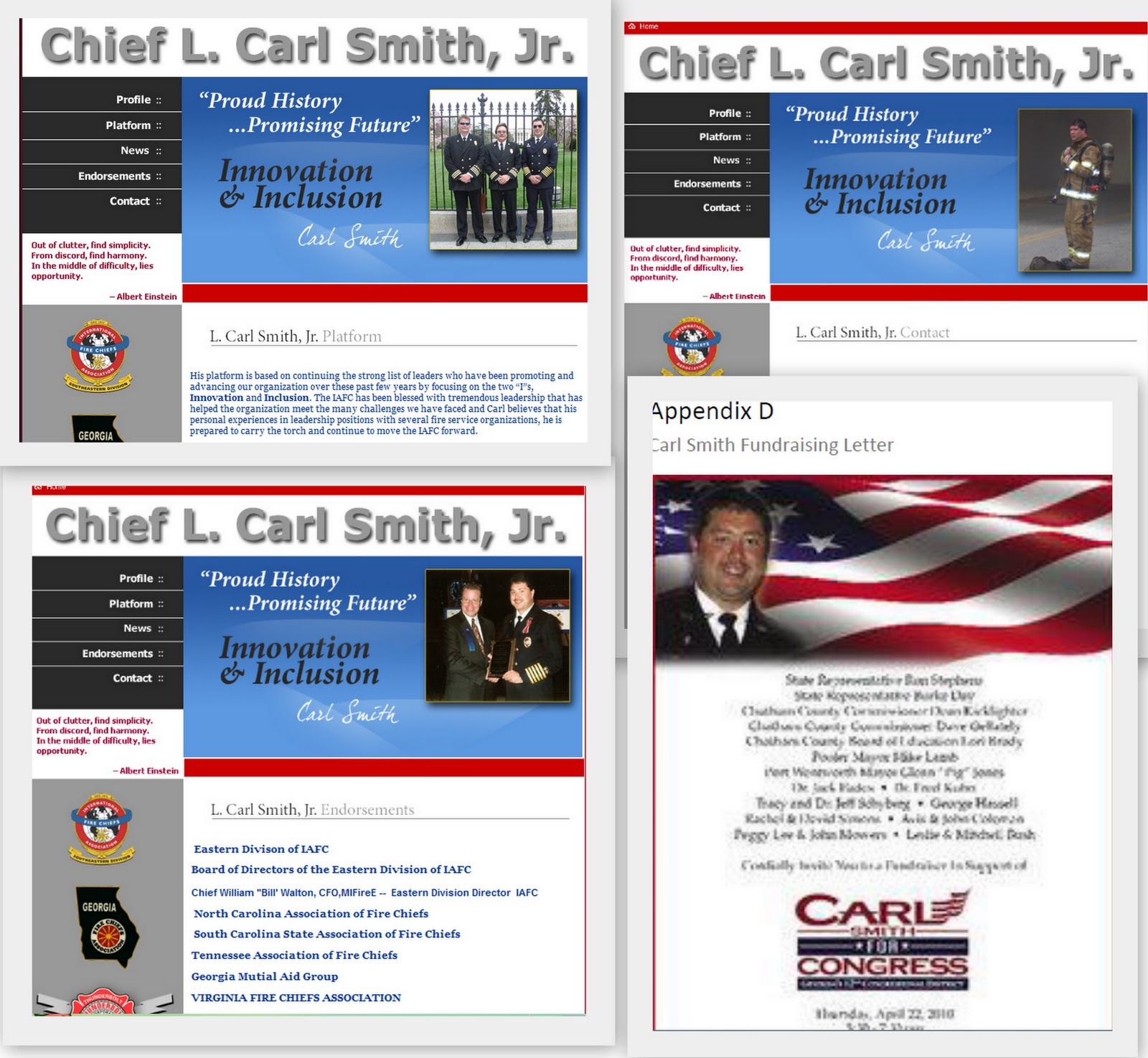 The report alleges that Smith, in his role as Fire Chief, used his office, uniform, and vehicle to campaign for public office in violation of the Hatch Act. Evidence included screen shots of Smith’s website which show him in various official uniforms on his campaign website and in fund raising letters like the ones below.