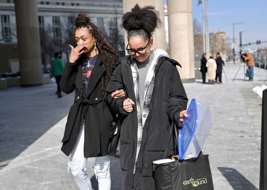 Tayauzhane Sanders, left, and Jasmine Williams, both former Internal Revenue Service workers leave their office after being laid off in downtown Denver on Thursday, Feb. 20, 2025. The IRS began laying off roughly 6,000 employees in the middle of tax season as the Trump administration via the Department of Government Efficiency (DOGE) works to downsize the federal workforce. (Hyoung Chang/MediaNews Group/The Denver Post via Getty)