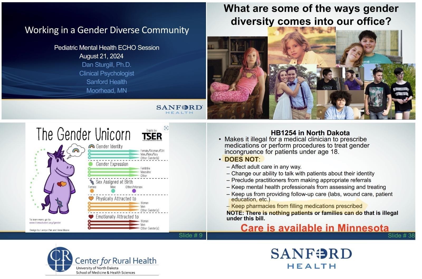 Another slide walks through HB1254 in North Dakota, acknowledging that it makes it “illegal for a medical clinician to prescribe medications or perform procedures to treat gender incongruence for patients under age 18.”