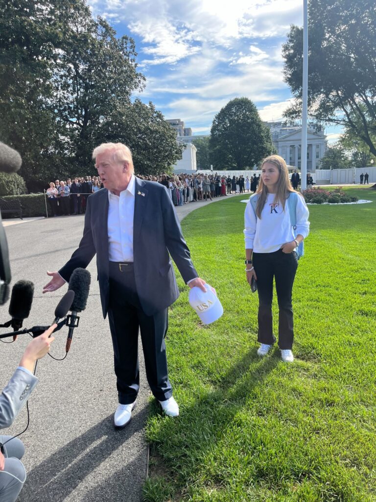 President Trump talks with reporters on the South Lawn as his granddaughter, Kai Trump, looks on., Friday, September 26, 2025.