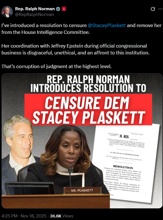 Whereas Delegate Plaskett’s willingness to receive instructions on official congressional proceedings from Epstein, a convicted felony sex offender with deeply concerning international associations, is especially alarming and inappropriate given her own past service in the U.S. Department of Justice and her current role on the House Permanent Select Committee on Intelligence, and raises serious questions about Delegate Plaskett’s judgement, integrity, and fitness to serve; and…