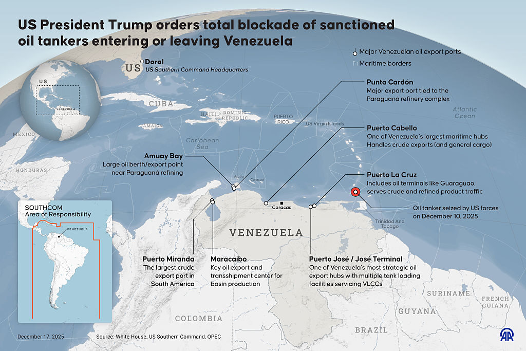 An infographic titled “US President Trump orders total blockade of sanctioned oil tankers entering or leaving Venezuela. (Photo by Murat Usubali/Anadolu via Getty Images)
