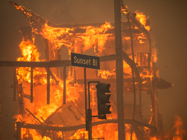 File/Flames from the Palisades Fire burn a building on Sunset Boulevard amid a powerful windstorm on January 8, 2025 in the Pacific Palisades neighborhood of Los Angeles, California. (Apu Gomes/Getty)