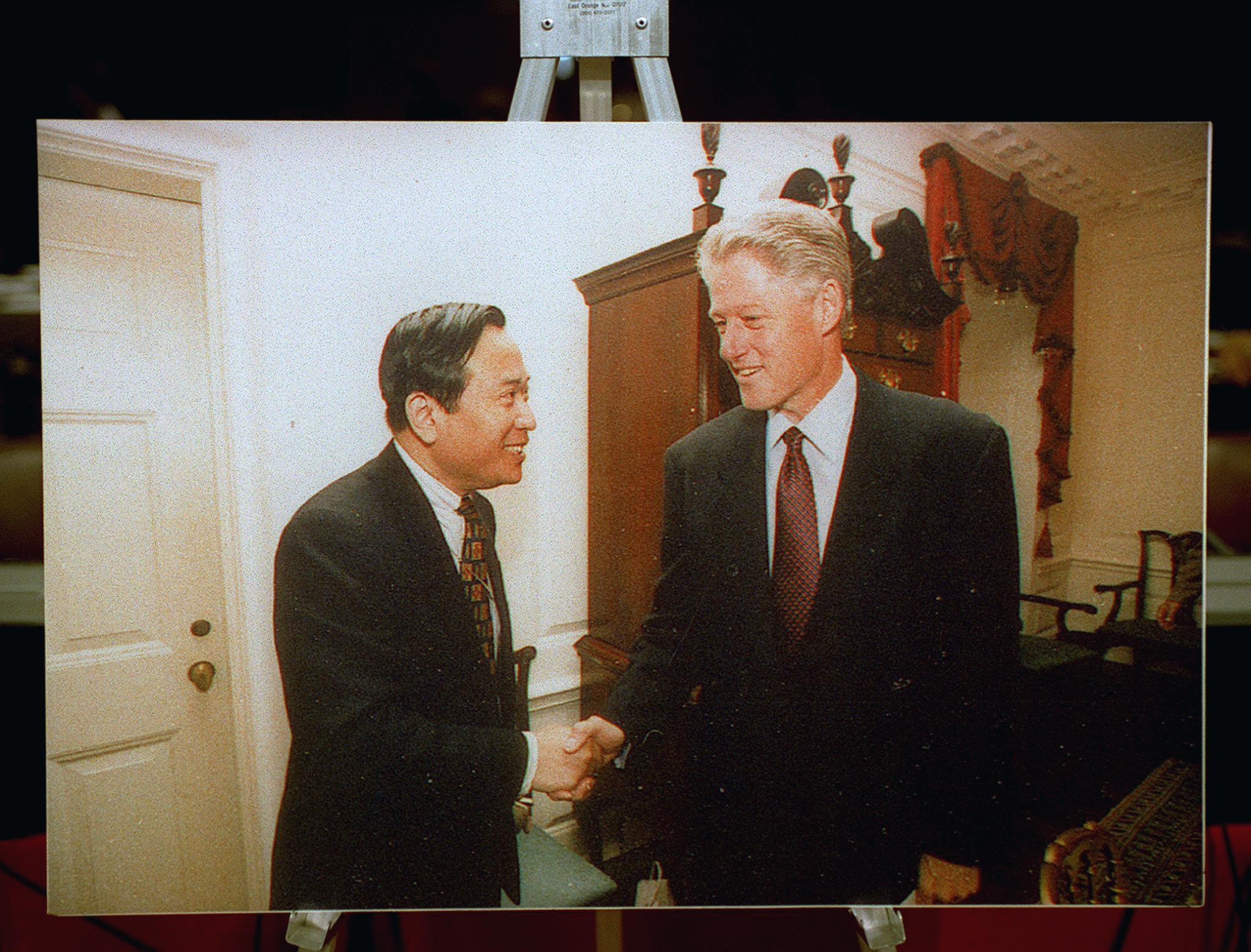 This photo on display during a Senate Government Affairs Committee investigating into campaign fund-raising abuses shows President Bill Clinton (right) shaking hands with Democrat fundraiser John Huang (left) during a meeting at the White House. (CHRIS KLEPONIS/AFP via Getty Images)