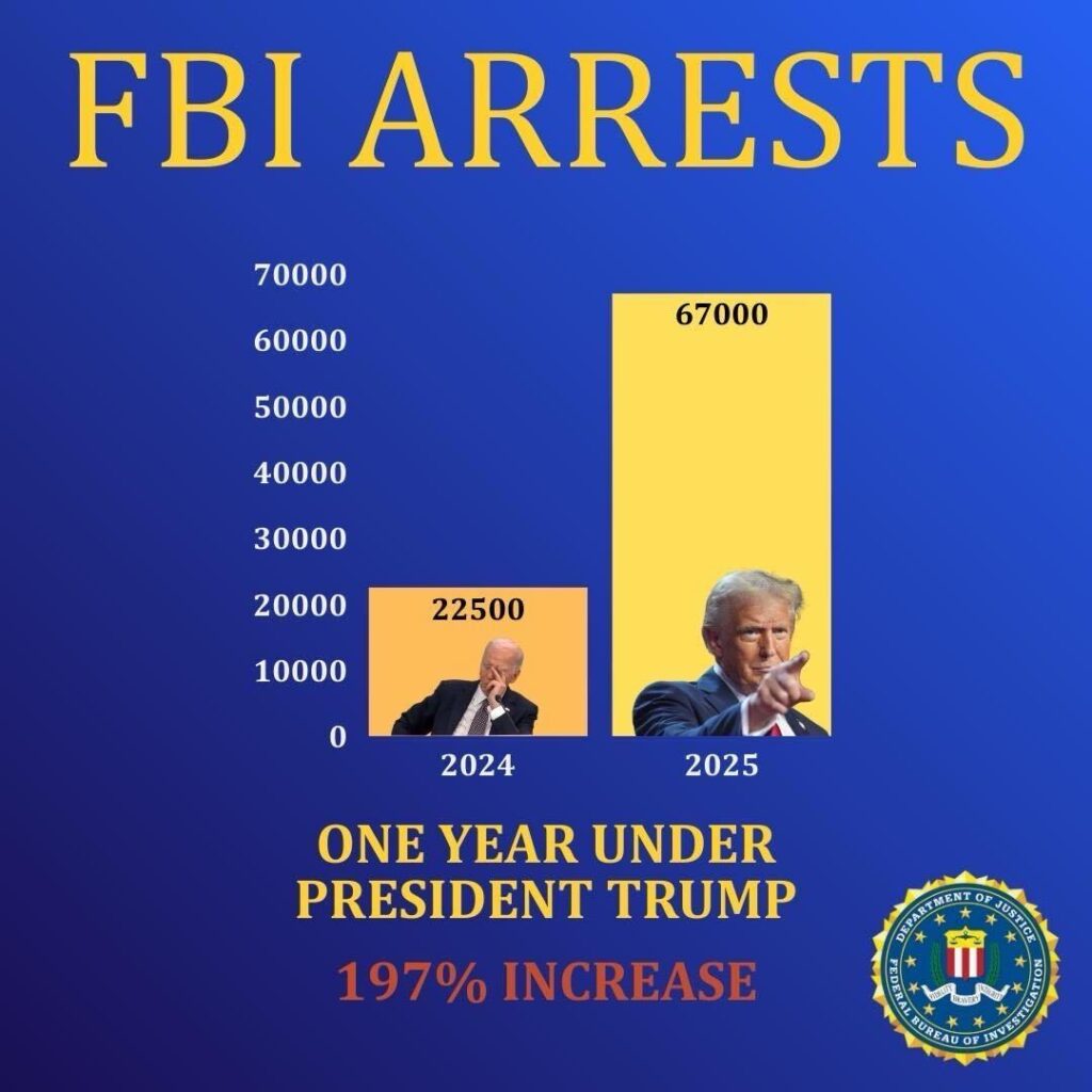 The FBI made 67,000 arrests in 2025—specifically from Jan. 20, 2025 to Jan. 20, 2026—versus just 22,500 in 2024, or Jan. 20, 2024, to Jan. 20, 2025. That represents an increase of 197 percent.