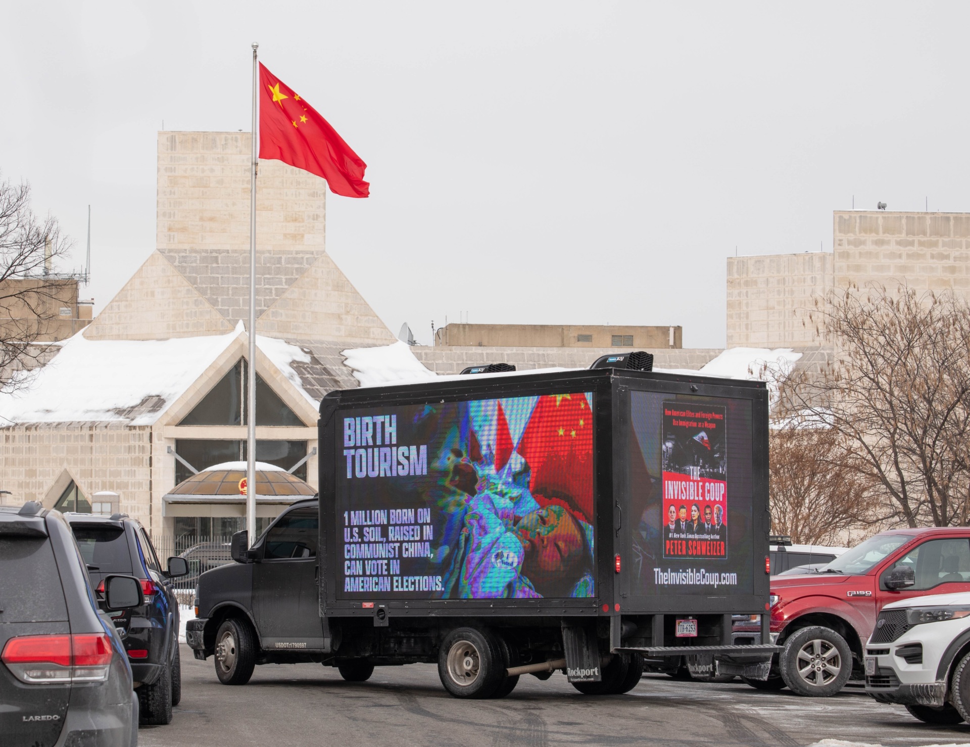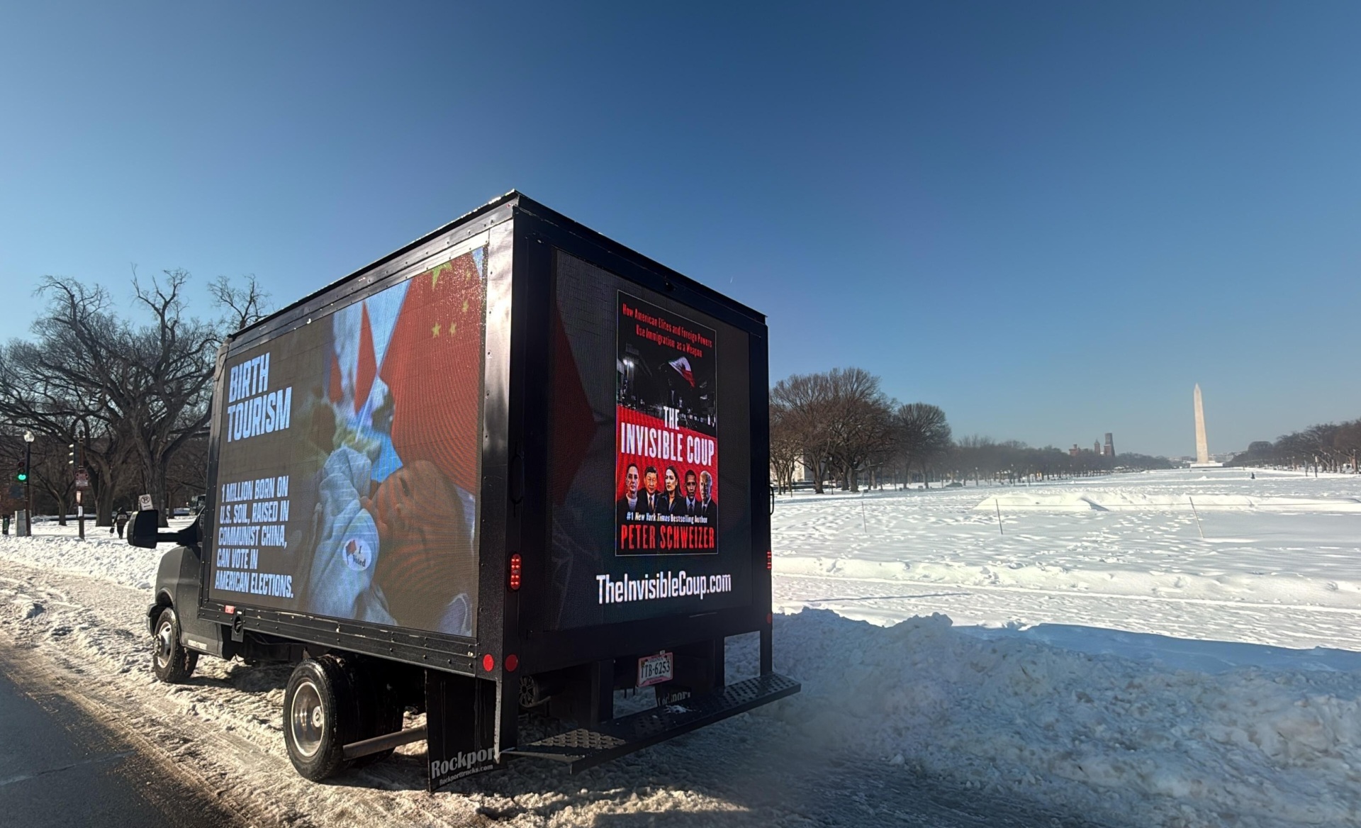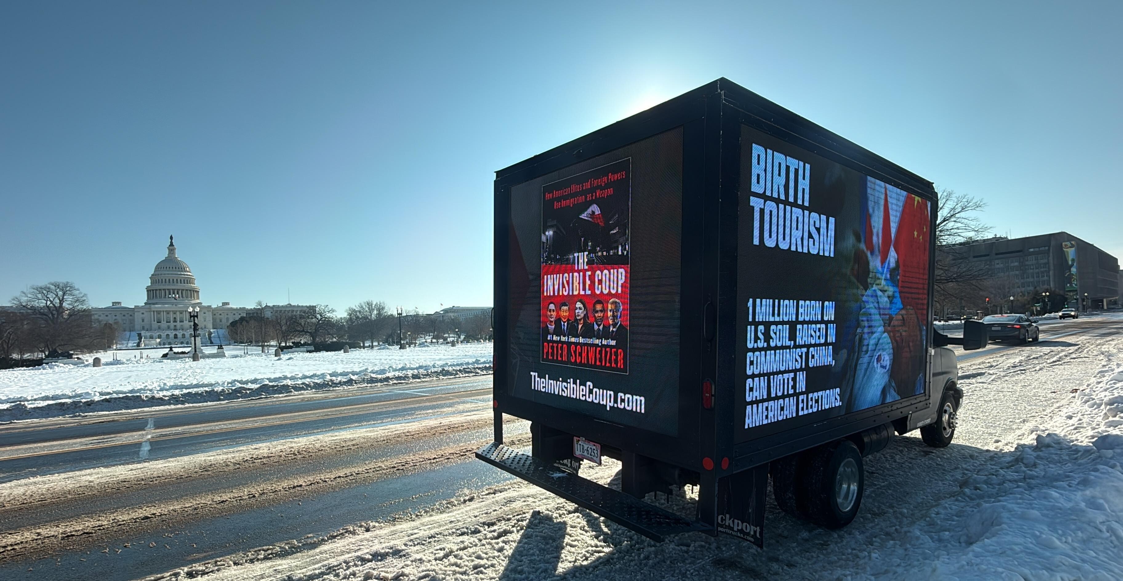 The billboard truck displayed a poster for Schweizer’s book on one side and a message on the other side stating: “BIRTH TOURISM” and “1 million born on U.S. Soil, raised in Communist China, can vote in American Elections.” It also included the website address for the book: TheInvisibleCoup.com.