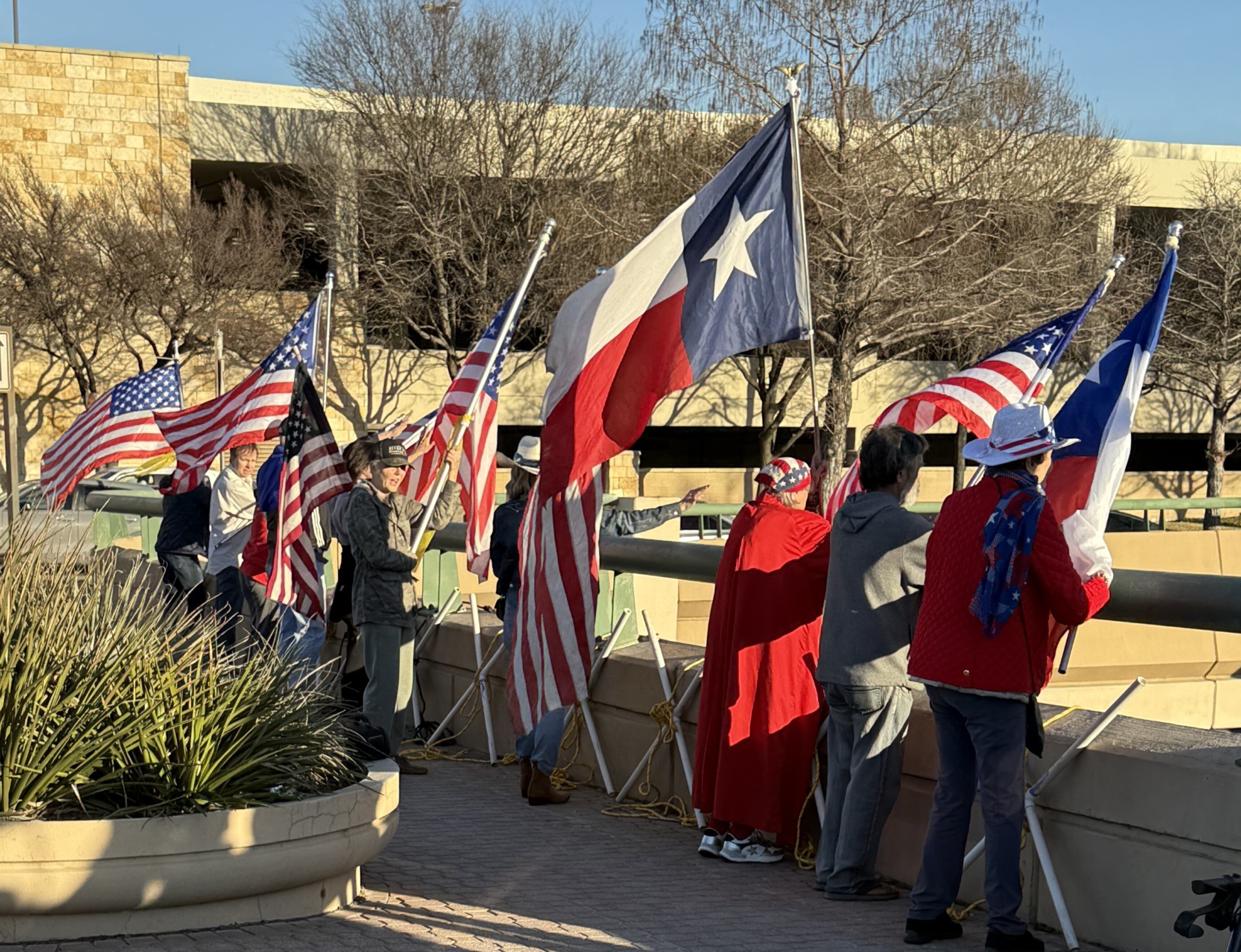 The Dallas 1776 Bridge Brigade members hold Texas and American flags after hanging a banner from the Northpark Boulevard Bridge over the U.S.-75 expressway in Dallas, Texas, on Thursday, February 5, 2026. (Photo courtesy of the Dallas 1776 Bridge Brigade)