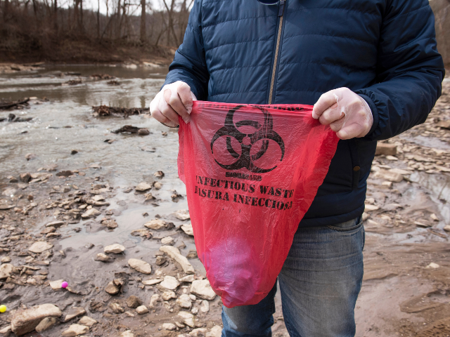 Potomac River Keeper Dean Naujoks, holds a biohazard collection bag while standing alongside the site where a massive pipe rupture has sent sewage spilling into the Potomac River, Friday, January 23, 2026, in Glen Echo, Maryland. (AP Photo/Cliff Owen)