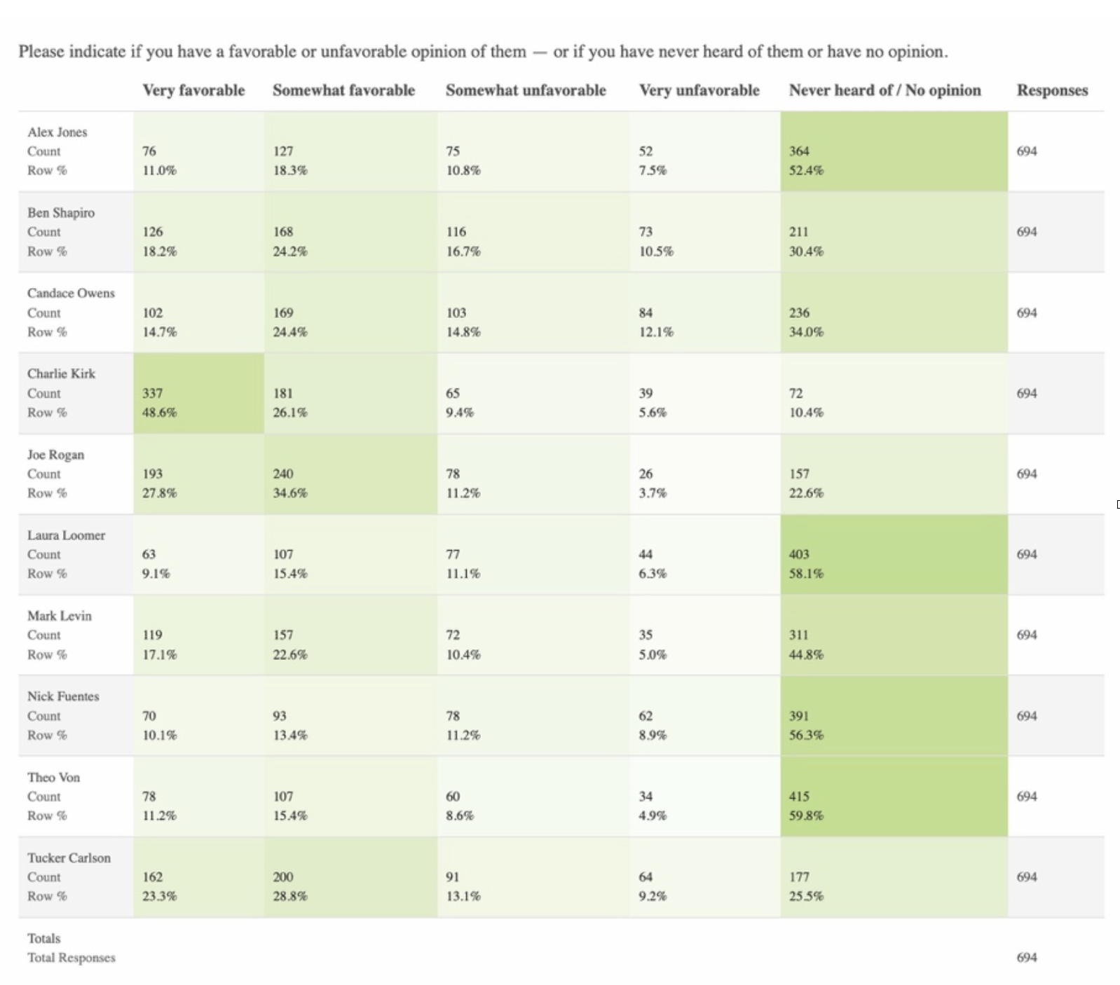 Conversely, rightwing commentators such as Mark Levin, Laura Loomer, and Nick Fuentes scored far lower on this key favorability index, with significantly larger portions not recognizing their names.