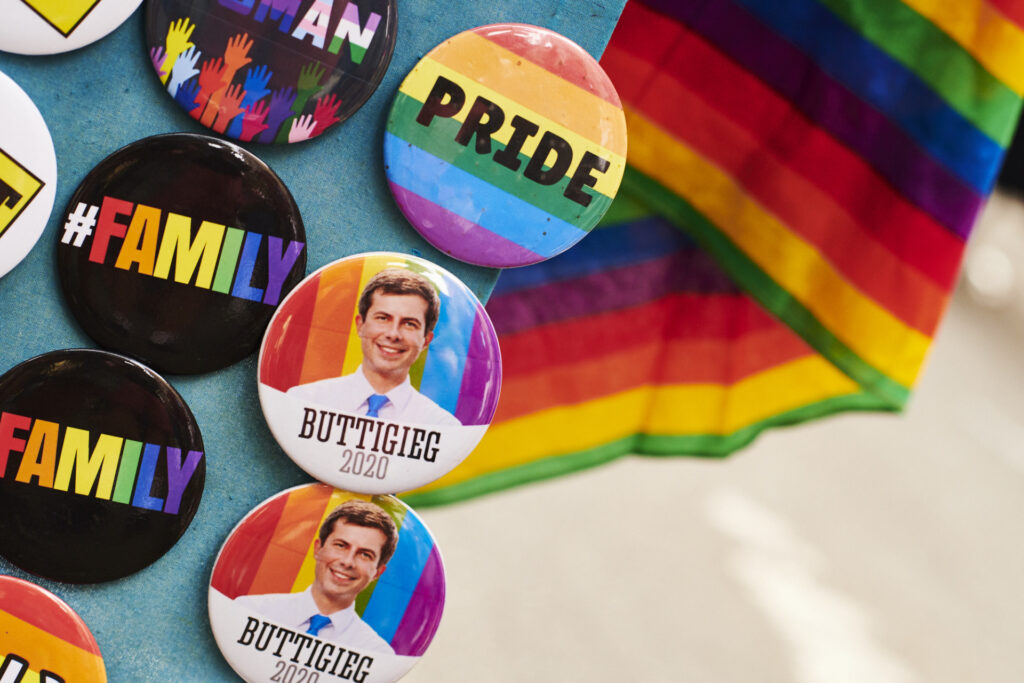 File/Campaign buttons for Pete Buttigieg, mayor of South Bend and 2020 presidential candidate, are displayed for sale during a Stonewall Inn 50th anniversary commemoration rally in New York, U.S., on Friday, June 28, 2019. (Gabby Jones/Bloomberg via Getty)