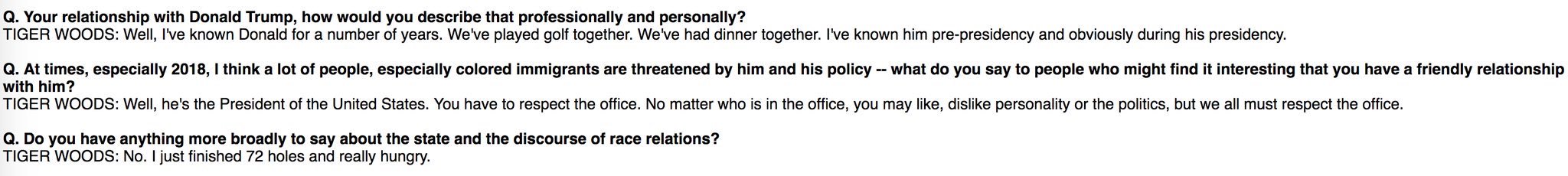 Woods was first asked about his personal relationship with President Trump, and whether he would describe it as “personal or professional.”