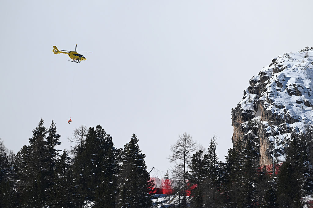 A rescue helicopter is seen flying to Lindsey Vonn of Team United States after she crashed during the Women’s Downhill on day two of the Milano Cortina 2026 Winter Olympics at Tofane Alpine Skiing Centre on February 08, 2026 in Cortina d’Ampezzo, Italy. (Mattia Ozbot/Getty)