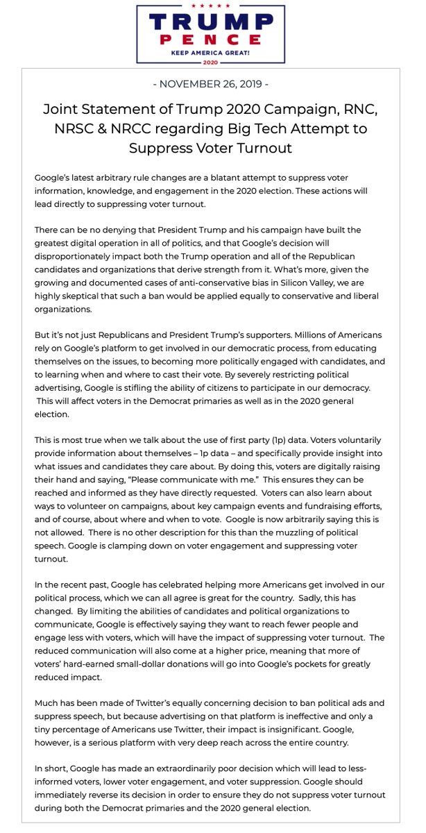 The Trump campaign, The Republican National Committee, the National Republican Senatorial Committee and the National Republican Congressional Committee have condemned Google’s decision to ban targeted political ads, calling it a “blatant attempt to suppress voter information, knowledge, and engagement.”