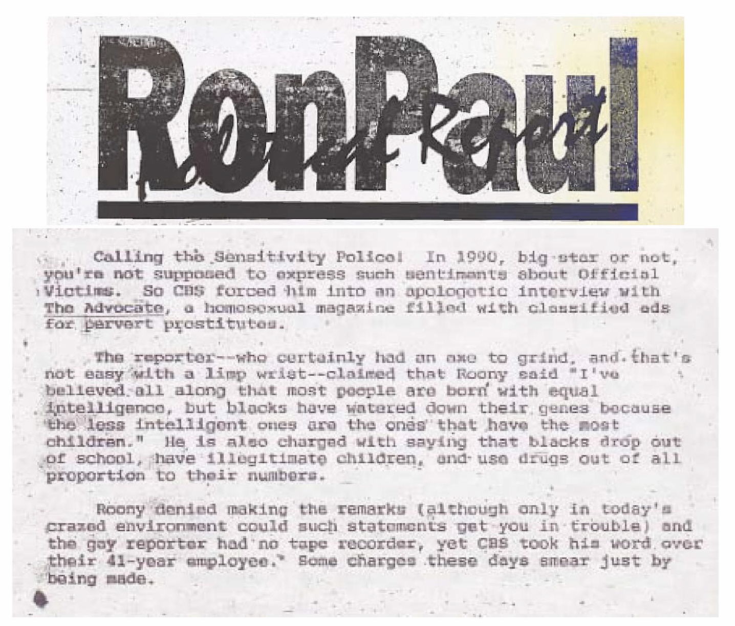 - May 22, 1996 Dallas Morning News reported “Dr. Ron Paul, a Republican congressional candidate from Texas, wrote in his political newsletter in 1992 that 95 percent of the black men in Washington, D.C., are “semi-criminal or entirely criminal.” He also wrote that black teenagers can be “unbelievably fleet of foot.” […]